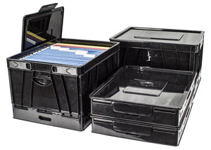 Open it when you need it, fold it when you don't. Keep this crate folded and handy in the office for files, in the car for supplies and groceries, or anywhere your would need a quick and useful storage box. Holds Letter or legal hanging file folders. Folds to only 3" thick.